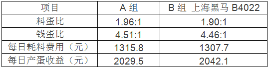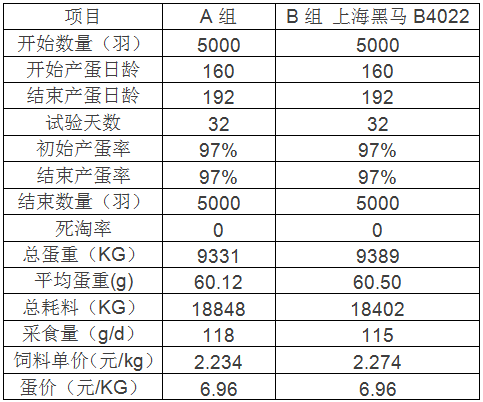 將10000羽雞分為兩組,分別飼喂黑馬B4022和另一知名品牌5%蛋雞料,用料32天后,計算實證數據核算經濟效益,為后期全群飼喂提供精確依據,飼喂數據如下: