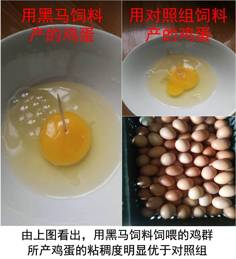 由上表可以看出,使用黑馬飼料5000羽蛋雞每天可節省飼料8.1元,每日雞蛋增加的收入是12.6元,照此生產性能推算,每10000羽蛋雞使用黑馬料1年比對照組要增加收益15111元。