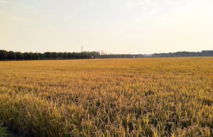 放眼一片片金黃色的稻田,遠處聯合收割機正在忙碌有序作業,一派豐收景象。