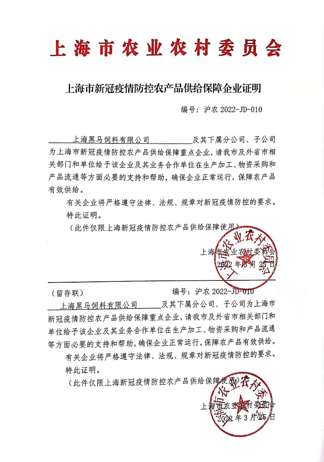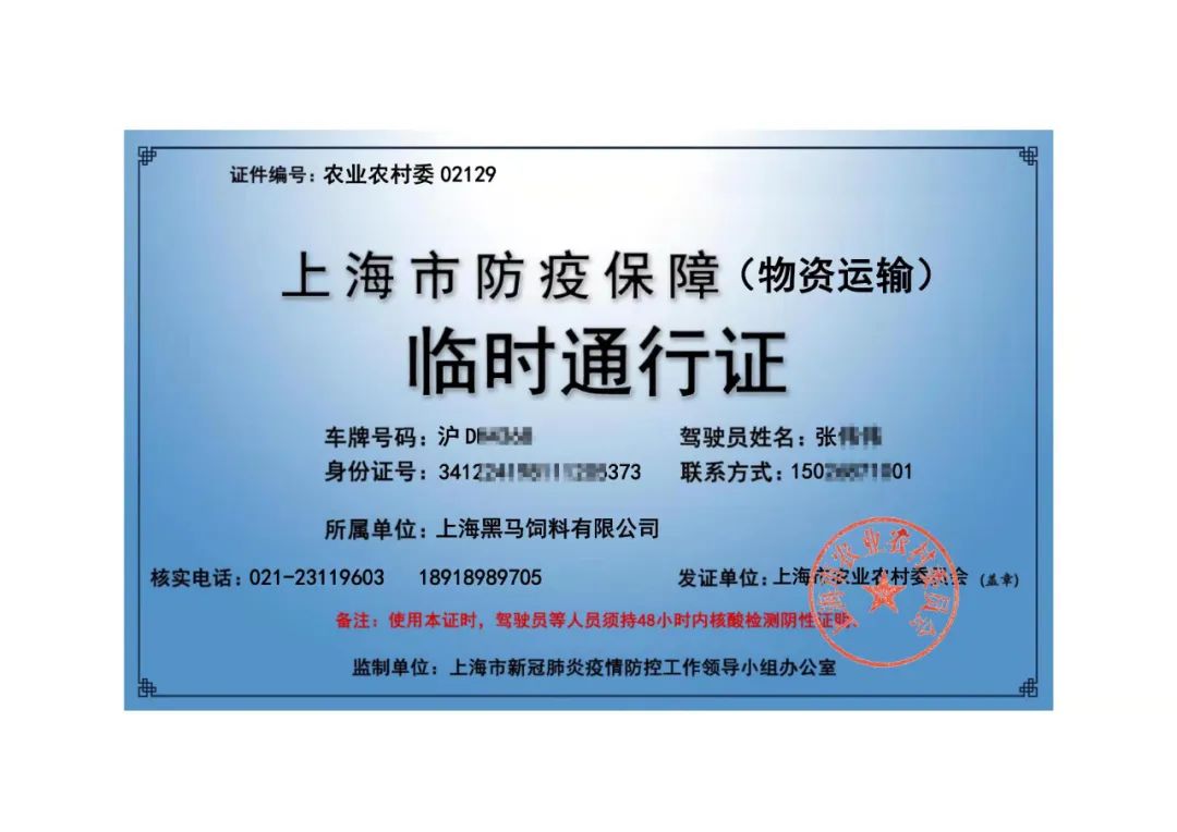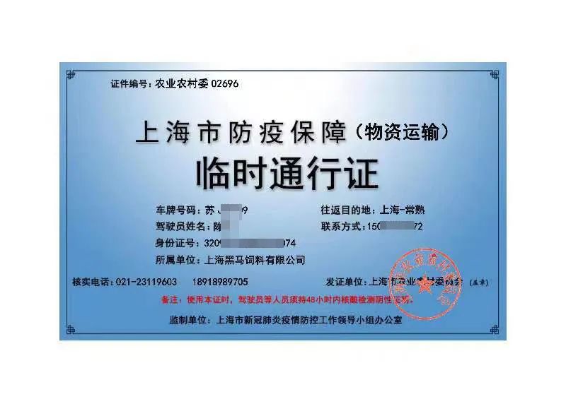 由于養殖業事關民生保障,而我司作為養殖業的上游企業,承擔著保障飼料供應的重要任務。基于此,市農業農村委將我司列為上海市新冠疫情防控農產品供給保障重點企業,并辦理好通行證及相關證明文件。