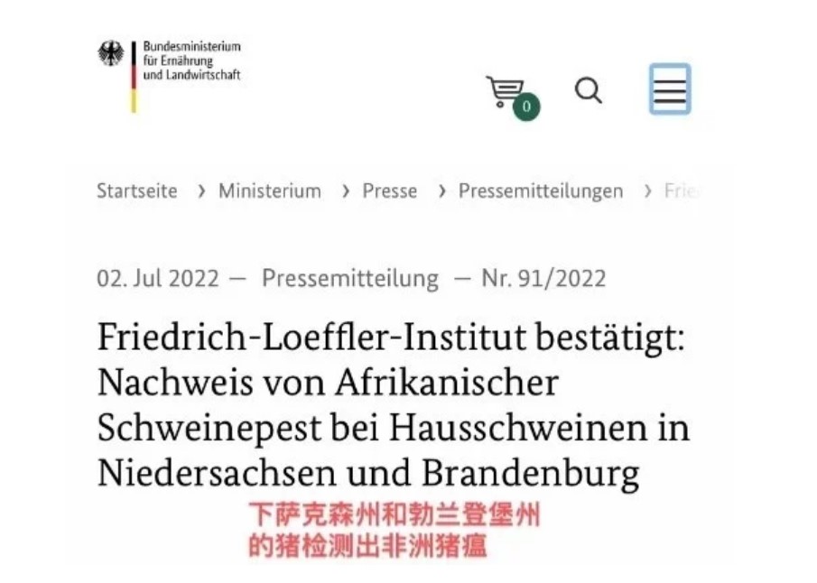 德國農(nóng)業(yè)部7月2日發(fā)布一份聲明稱,德國西北部的下薩克森州和東部的勃蘭登堡州的農(nóng)場檢測出非洲豬瘟,這是德國國內(nèi)兩個養(yǎng)豬大州。