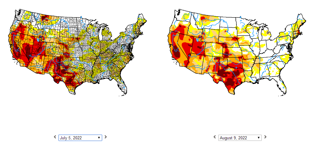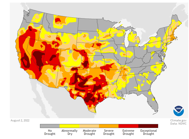 根據美國國家海洋和大氣管理局(NOAA)的最新的季節性干旱展望,美國近60%地區維持干旱狀態概率超50%。美國西部持續干旱,并且南部平原和密西西比河下游同樣如此。美國西部從2022年開始持續干旱且仍將持續,西部11個州的中度至特大干旱(D1至D4)的覆蓋范圍在2021年12月7日達到略低于95%的峰值之后,每周幾乎穩定在88%到 90%之間。美國南部、西部大部分地區氣溫高于往年水平。