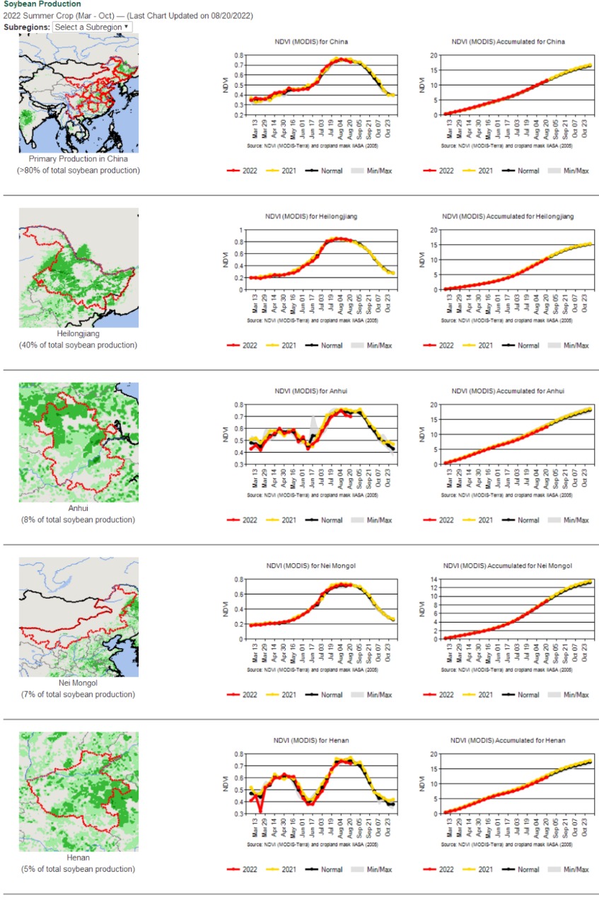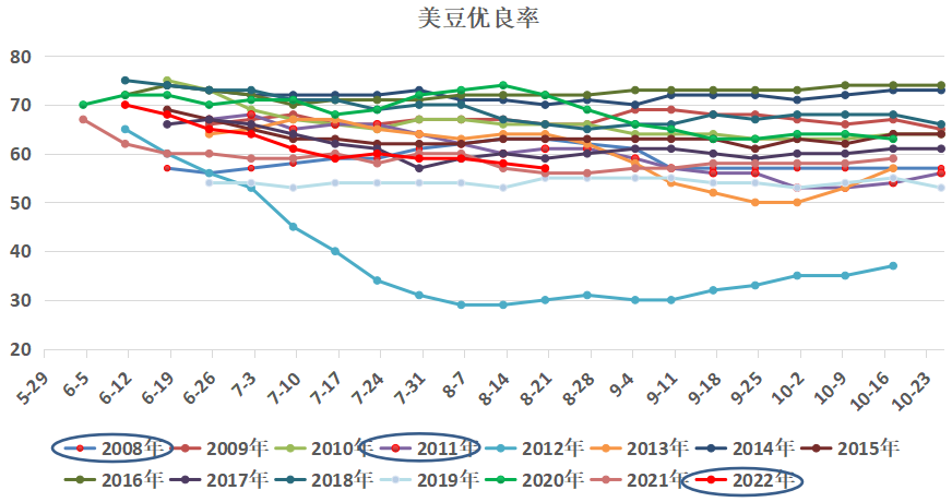 目前中國和美國大部分大豆處于結莢期,9月開始中國和美國大豆將進入收獲期。雖然7月份美國大豆產區遭遇了一些干旱,但是從截止8.21號的美豆優良率來看仍舊高于去年同期水平。