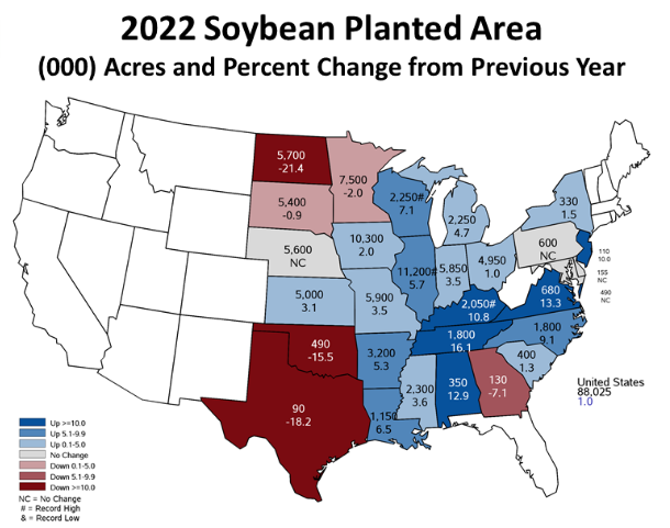 氣候是影響玉米產量的主要因素,當玉米種植期極度潮濕或生長期雨水不足時,都會使玉米產量大幅減少。美國玉米種植時間最早可從四月初開始,玉米帶的北部最晚于五月底完成,而美國南方的玉米產州最早可于三月種植。美國農業部(USDA)6月預期種植報告顯示,2022年玉米種植面積預估降至8990萬英畝,同比下降4%。6月底的種植面積報告聲明,大雨導致南北達科他州和明尼蘇達州播種作業延遲,8月的供需報告對南北達科他州和明尼蘇達州的種植面積重新做出調查并發布,最終,南北達科他州玉米種植面積較6月未做調整,明尼蘇達州面積下調10萬英畝,總面積下調10萬英畝至8980萬英畝。美國農業部指出,在48個州中,有35個州的種植面積保持穩定或略低。預計收獲面積也較去年同期下降4%。