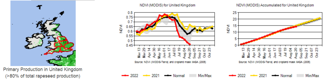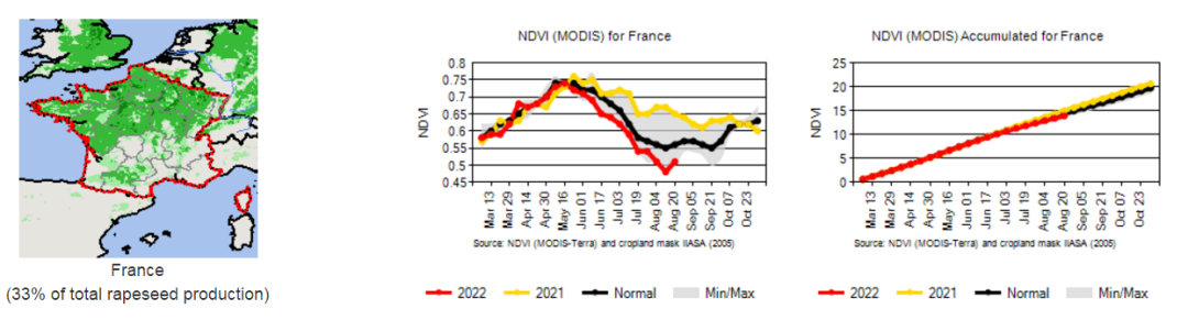 8-9月正值歐盟和英國菜籽的播種期。目前德國由于缺乏水分,宣布菜籽種植工作將被推遲。最晚9月中旬沒有明顯的降雨,德國、法國、英國的菜籽種植面積可能下降。根據美國農業部8月供需報告的預估2022/23年度德國、法國菜籽產量占全球14.1%,英國占1.5%,合計占全球菜籽產量的15.6%。而從世界農業氣象的網站預測數據顯示,到9月5號之前,法國、德國、英國仍舊面臨高溫少雨的威脅。2018-2020年期間歐洲曾經歷過1540年以來最為嚴重的干旱,而目前的數據表明今年的干旱可能比2018年的情況更為嚴重。2018-2020年期間,歐盟菜籽播種面積較2017年最大下滑23%,假設2022年法國、德國及英國菜籽播種面積因干旱下滑25%-35%,那么可能導致全球菜籽減產3.9-5.46%,相當于321.6萬噸-450.3萬噸,那么全球菜籽的供需可能進入比上一年度更為緊張的階段。因此,9月中旬前,菜系(菜籽、菜粕、菜油)都可能獲得來自歐洲干旱的支撐。