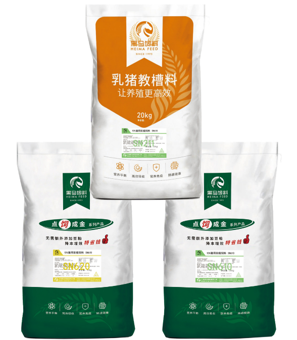 黑馬“點飼成金”教保育肥套餐,包含教槽料SN211、保育濃縮料SN620和育肥濃縮料SN610三個產品,產品結構簡單明了,無需額外添加豆粕,讓生物安全防控工作更加簡便。同時,該產品套餐采用高氨基酸低蛋白日糧技術設計,減少營養成分的浪費,降低糞便處理的環保負擔。